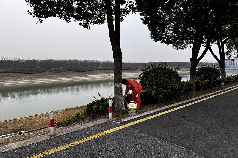 在各个站区,专业养护团队依据科学配比,严谨调制涂白剂,确保其具备良好的防虫、杀菌与保暖性能。养护人员认真地对每一株苗木进行涂刷,从根部至树干分叉处均匀涂抹,使白色防护层整齐划一,如同为苗木披上了一件件洁白的“防护服”。这不仅能有效反射阳光,缓解昼夜温差对苗木的伤害,预防冻害发生,而且涂白剂中的药物成分还能抑制病菌滋生、驱赶害虫,降低来年病虫害侵扰风险,为乐玩·体育站区的绿化苗木构筑起坚固的健康防线。