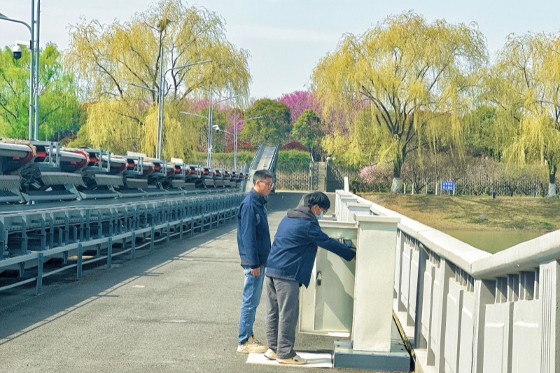 在淮安四站的工程现场,管理人员正在开展清污机调试工作,与远处随风摇曳的柳枝,迎风盛放的花树绘就春景如画。