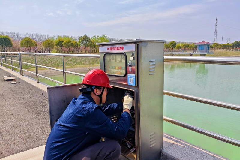在淮阴三站工程现场,3#清污机电源柜检修工作正在进行,一池春水碧色缱绻,群树竞发点缀春日融融。